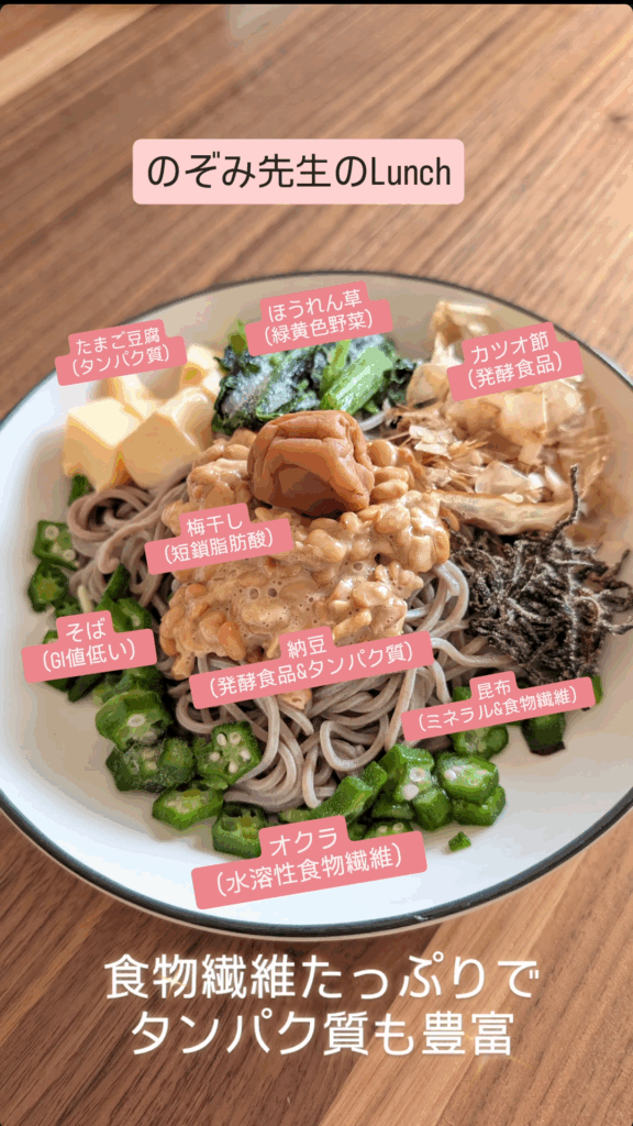 私のランチは、「たんぱく質」「食物繊維」「発酵食品」の3つを意識して、彩り豊かに盛り付けるのがこだわりです。