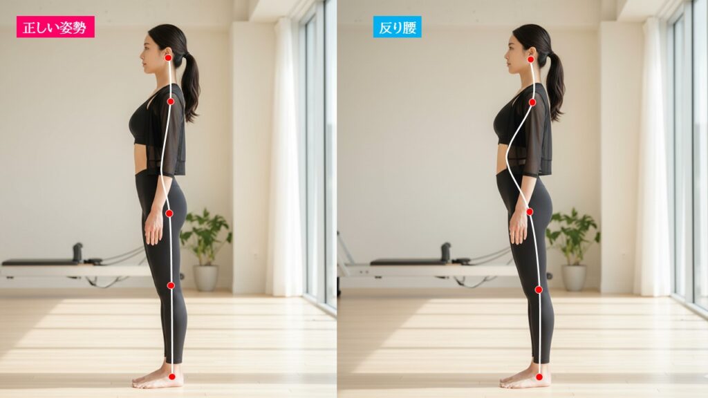 反り腰とは、腰が過度に反り、お腹を突き出してしまう状態のこと。これにより、内臓が下がり、実際は細くてもお腹がポッコリと見えてしまいます。