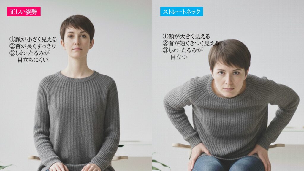 ストレートネックや巻き肩は、首を短く見せ、背中を丸くしてしまいます。これが、実際の体重以上に老けた印象や太った印象を与えてしまうのです。