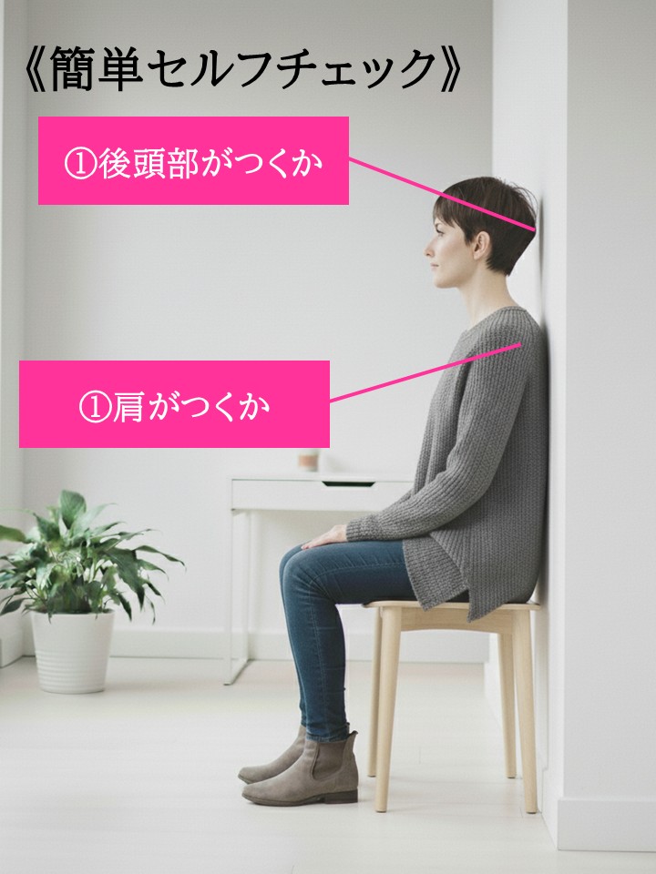 - もし頭が壁につかない、または無理に後ろに引かないとつかない場合、「スマホ首」の可能性が高いです。